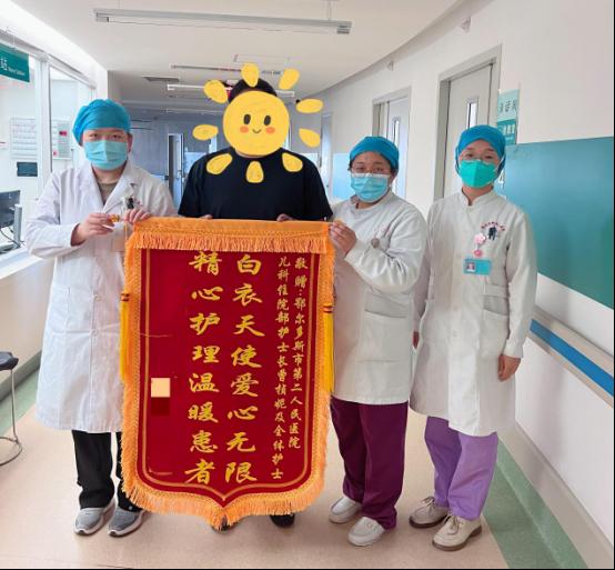患兒咳嗽半月余,咳嗽呈痙攣性,咳時面紅、流淚、口唇發(fā)紫,時有嘔吐等情況,夜間明顯,嚴(yán)重時整晚都不能入睡,間斷在多家醫(yī)院就診后不能明確病因,于2024年4月30日在市第二人民醫(yī)院兒科被確診為“百日咳”收治住院,經(jīng)兒科病區(qū)醫(yī)護人員給予治療后,患兒病情明顯改善。在住院期間患兒有任何不適,兒科病區(qū)醫(yī)護人員能夠及時給予解決,為患兒創(chuàng)造了舒適的就醫(yī)環(huán)境和良好的就醫(yī)體驗。經(jīng)過兒科病區(qū)醫(yī)護人員的共同努力,患兒住院治療7天后治愈出院,出院當(dāng)天,患兒家屬特地為兒科病區(qū)醫(yī)護人員送來錦旗以表感激之情,錦旗代表著患兒家屬的認(rèn)可和信任,兒科病區(qū)醫(yī)護人員將持續(xù)用專業(yè)的技術(shù),溫暖的服務(wù),用心照護每一位患者。