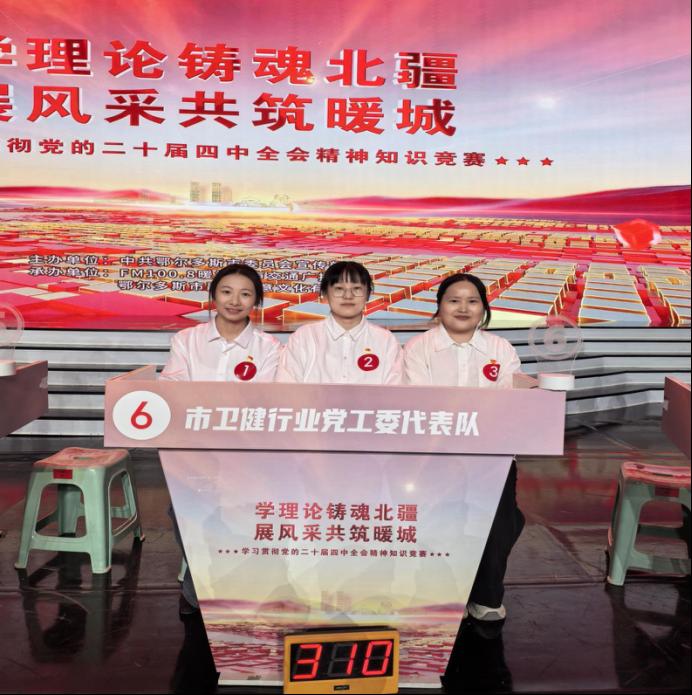 2025年11月21日,鄂爾多斯市學習貫徹黨的二十屆四中全會精神知識競賽成功舉辦,我院職業(yè)衛(wèi)生科黨員郭玉嬌作為市衛(wèi)健行業(yè)黨工委代表隊選手,與隊友密切配合、沉著應(yīng)戰(zhàn),助力團隊榮獲二等獎,充分展現(xiàn)了我院黨員干部過硬的理論素養(yǎng)和昂揚的精神風貌。