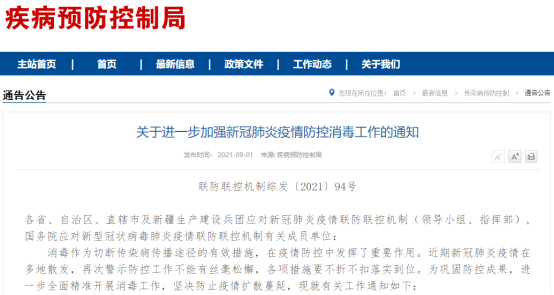 近日,國務(wù)院應(yīng)對(duì)新型冠狀病毒肺炎疫情聯(lián)防聯(lián)控機(jī)制綜合組下發(fā)了《關(guān)于進(jìn)一步加強(qiáng)新冠肺炎疫情防控消毒工作的通知》(聯(lián)防聯(lián)控機(jī)制綜發(fā)〔2021〕94號(hào)),內(nèi)容包括新冠肺炎疫源地消毒技術(shù)指南、公共交通工具消毒操作技術(shù)要求、公共場(chǎng)所消毒操作技術(shù)要求、醫(yī)療器械及環(huán)境物體表面消毒推薦方法、冷鏈?zhǔn)称飞a(chǎn)經(jīng)營過程消毒操作技術(shù)要求等。
